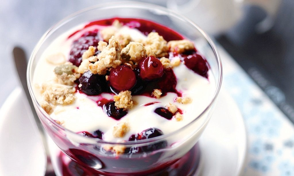 2 Pots of delicious granola, topped with yogurt and fruit compote.